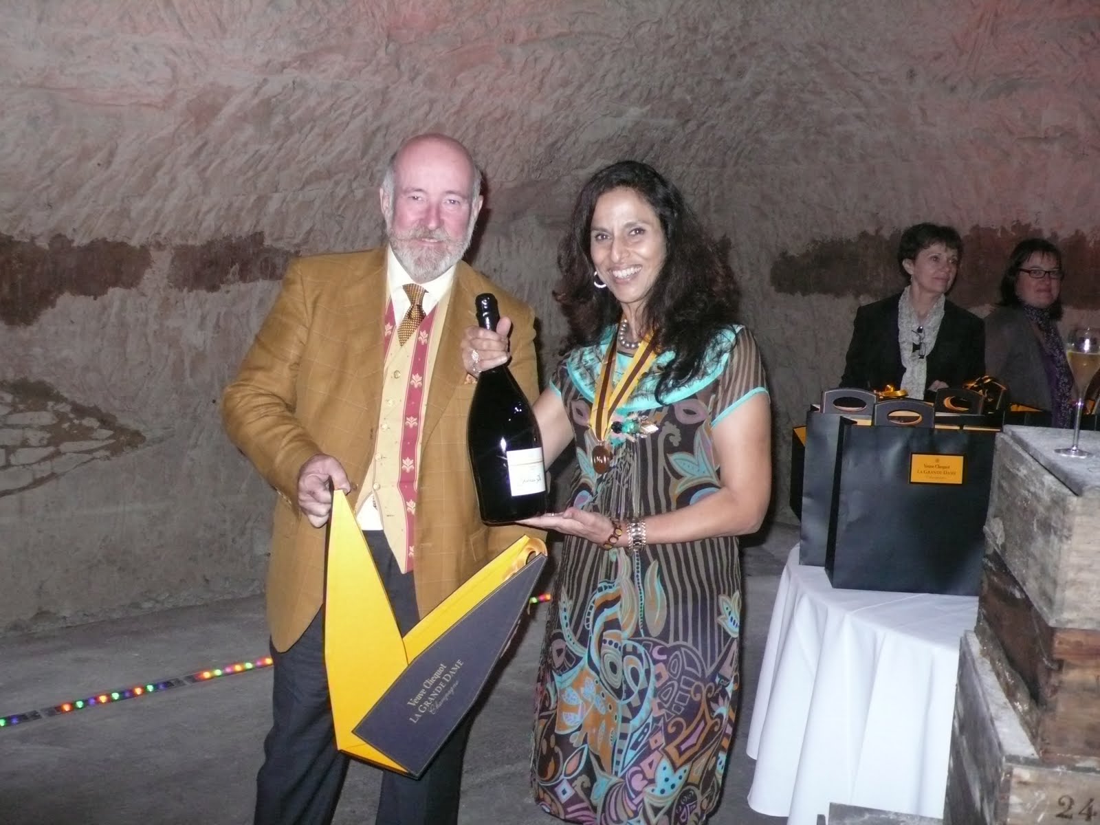 That's the jovial direct descendent of Mme. Clicquot after presenting a personalised, signed botle of La Grande Dame in the chalky 24 kms long, underground cellars of the estate.