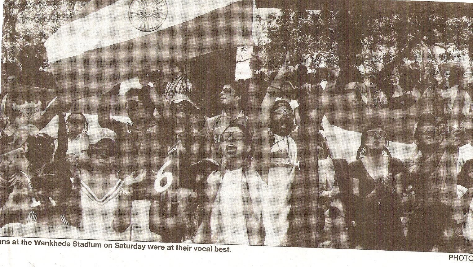 I was just so thrilled to spot this picture in the Asian Age this morning which captures two of my daughters (Arundhati and Anandita) at the historic match. Being a part of this stupendous event, was a life transforming experience they both said, with tears in their eyes. A memory they will cherish forever.... an occasion they will never ever forget. Understandable. Being amongst the lucky 33,000 mesmerised spectators inside the Wankhede Stadium as Dhoni ( super cool in his new 'ganja' avatar!) lifted the cup, has to count as a defining moment for any cricket-loving Indian. Seeing this picture in the papers has added to my daughters' thrill. It will be a really special memento to share with their own kids later in life.... and boast , "I was there when India won!" The girls were even more lucky this afternoon as they drove past Mantralaya and came alongside the team bus ferrying our Boys back from the reception at the Raj Bhavan. Fans who spotted them ( the cricketers ), cheered wildly as India's biggest ever heroes waved and smiled....looking exceptionally dashing in their brand new striped jerseys.