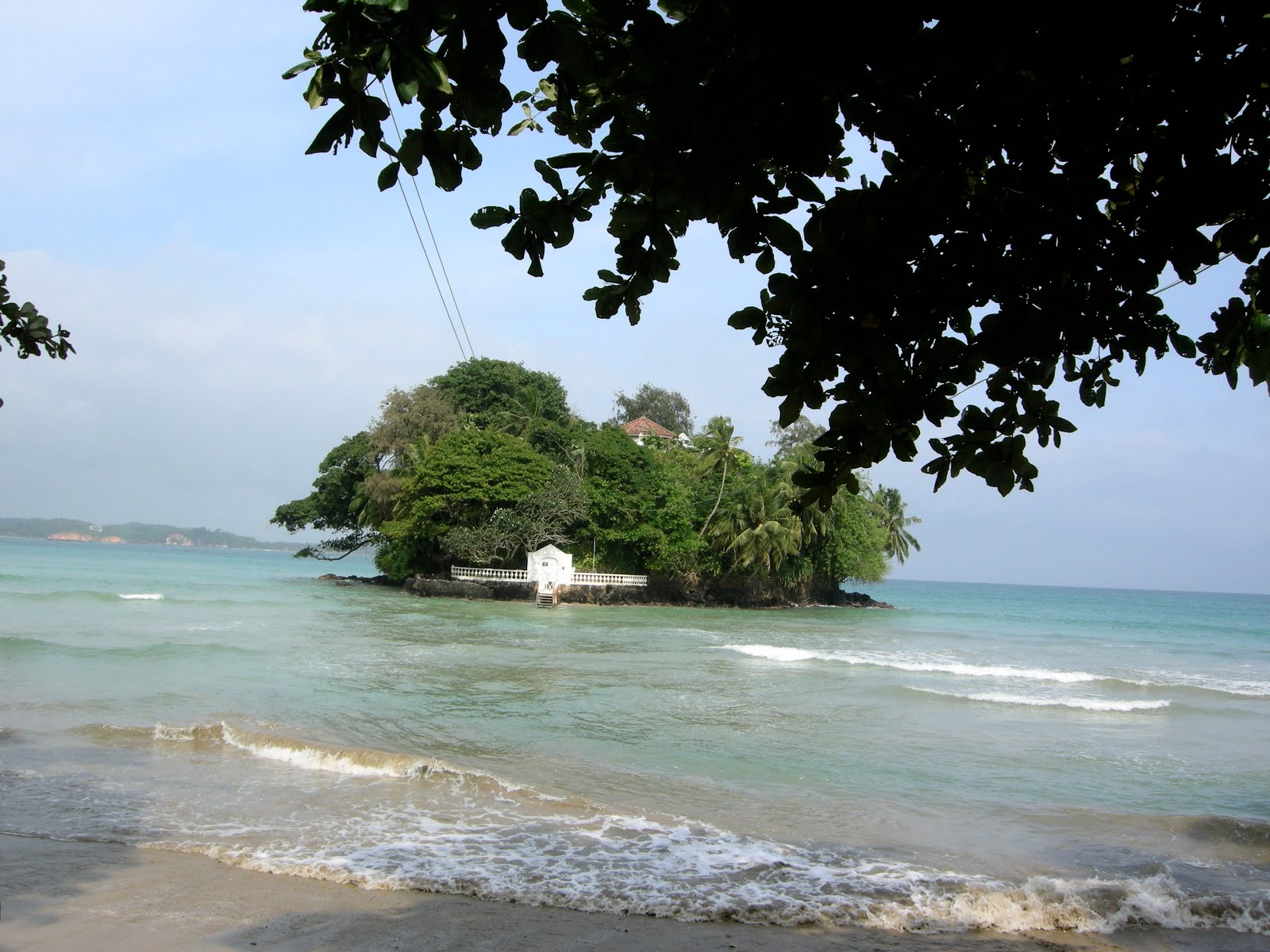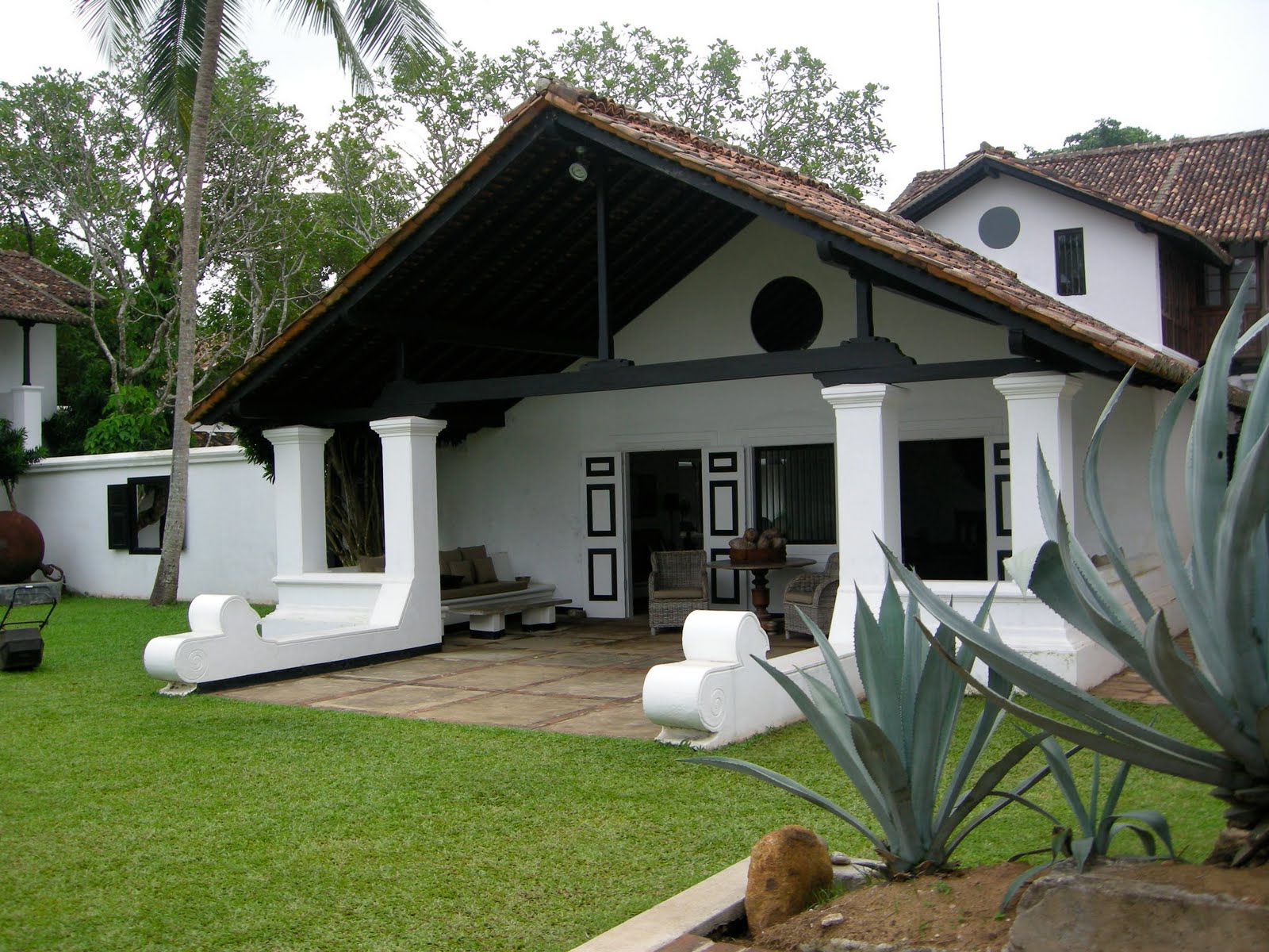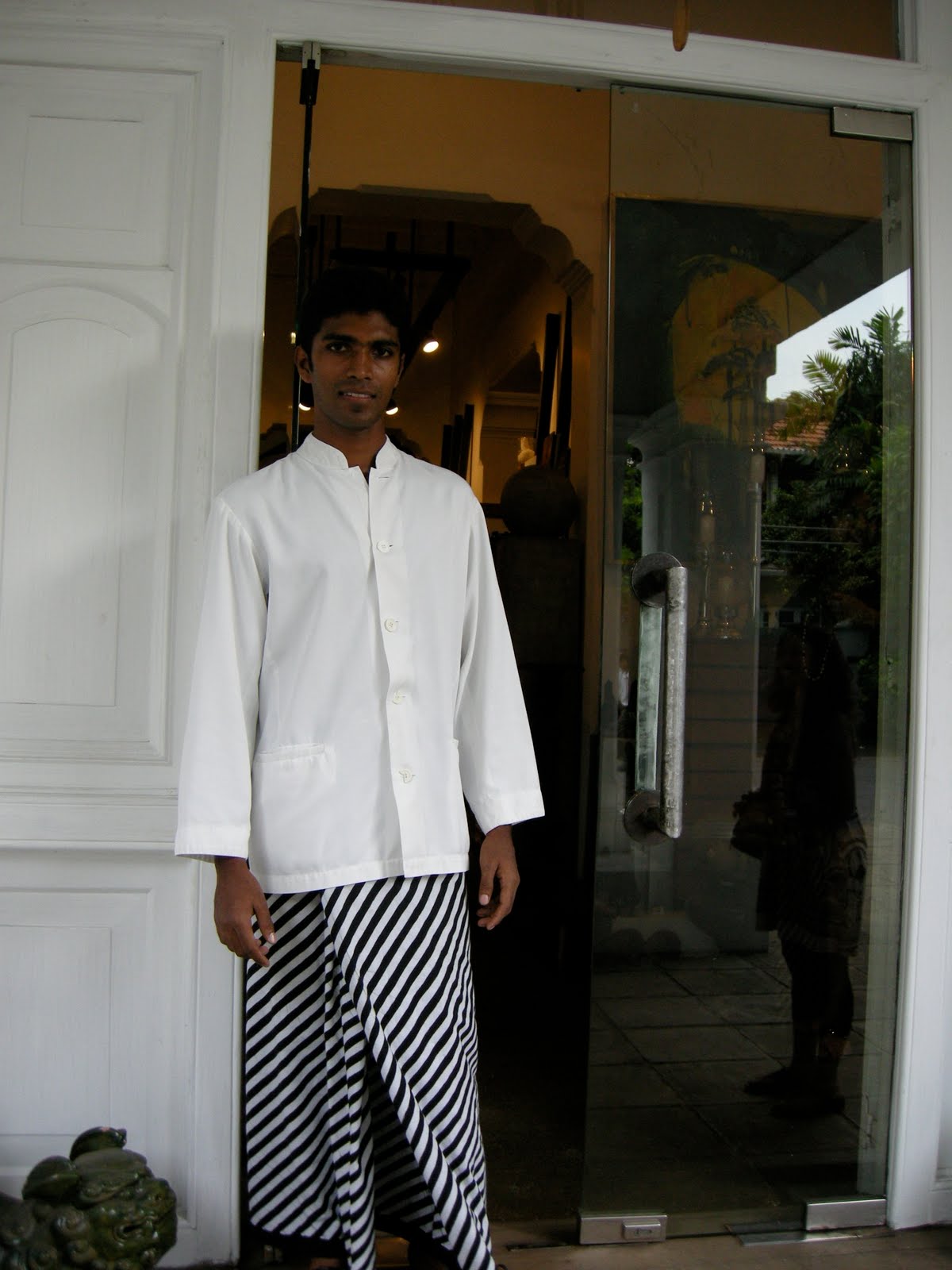 About the pictures. The one of me was clicked by Arundhati after I had waded through neck deep water and was getting ready to wade back to shore after a splendid lunch at 'Taprobane' ( travel writers justifiably go gaga over the uniqueness of the experience). The other pics are of the handsome and polite attendant posted outside one of the world's most artistic homestores called Paradise Road. He is wearing the store's trademark batik sarongs - aren't they gorgeous? The black-and-white bungalow you see was designed by Sri Lanka's legendary architect Geoffrey Bawa, and is now run by Shanth ( the undisputed emperor of style and elegance ) as a charming boutique hotel in Bentota. One of the other pics gives you an idea of just how much water visitors have to navigate to reach the island-hotel I'd mentioned earlier. There is also a pic of the Bodh tree in the temple complex I visited ( Arundhati and I watered it, as per tradition). And the last pic is of Shanth's courtyard - part of another Bawa property ( this is where the architect used to live). Shanth has changed it around and it now houses the smart Gallery Cafe and an art gallery\souvenir shop.