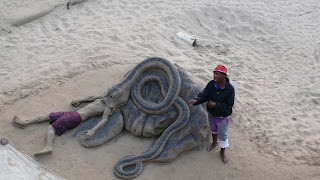 I can't get South Africa out of my system. I took this shot in Durban, along a deserted seafront, where I was told it was insane to pull out a camera or cell phone. Well, I did both and am alive to tell the tale. On both sides of the jetty, there were these incredible but disturbing sand sculptures. Locals warned me the artists were dangerous druggies who lured innocent tourists into admiring their work before robbing them. Forget all that - just look at the morbid subject. I thought it was it was pretty apt, given the situation there.