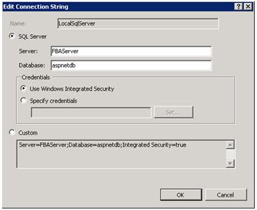 <add name="SqlAuth" connectionString="Data Source=FBAServer;Integrated Security=SSPI;Initial Catalog=aspnetdb;" />