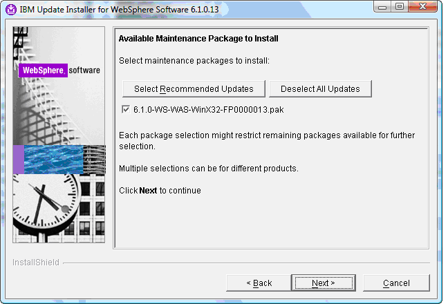 This is the first update we will apply to WebSphere Application Server; it will update the server from version 6.1.0.0 to 6.1.0.13.