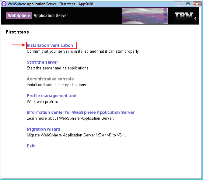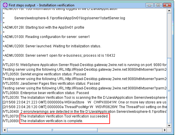 After clicking Installation verification, a console window will open up and WebSphere will be started, displaying it's startup log to the console window.