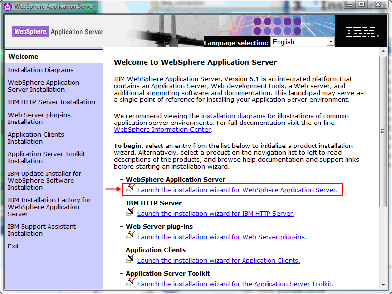 After Launchpad starts you want to click the first option, to run the WebSphere Application Server installer: